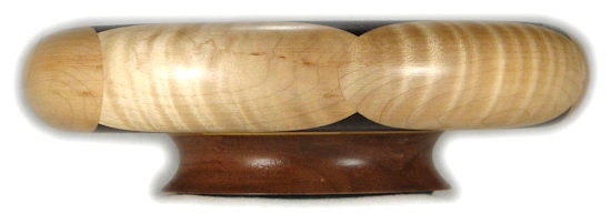 COMMENTS: Other than a slight imbalance in the redheart in lower right (it narrows visibly as it goes from lower left to upper right, the symmetry is excellent, and I am very pleased with the choice of contrasting woods. A couple of the pieces of curly maple are only so-so but the rest of the rim all has an excellent curl as you can see in the pics.
