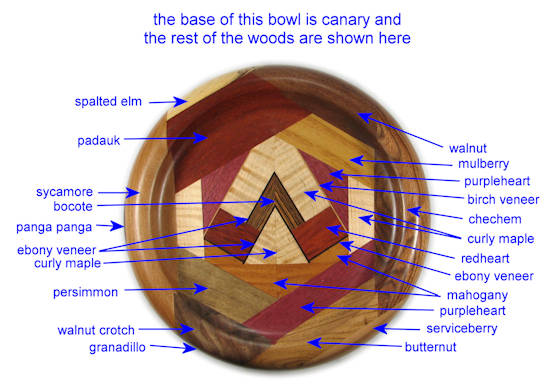 comments: I really like the middle on this one, but I have to say that I'm not as happy with the way the thick piece of padauk in the upper left seems to be not properly balanced, visually, by the walnut and mulberry in the upper right; the upper part of the bowl just has an unbalanced look to me, although only when viewed from above. Fortunately, the striking visual impact of the BOX pretty much makes up for it.