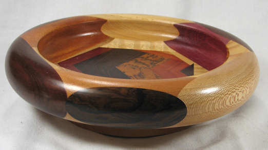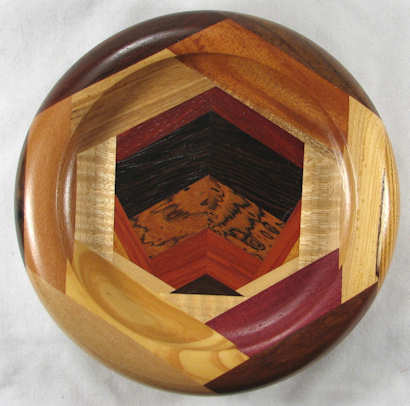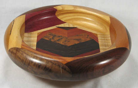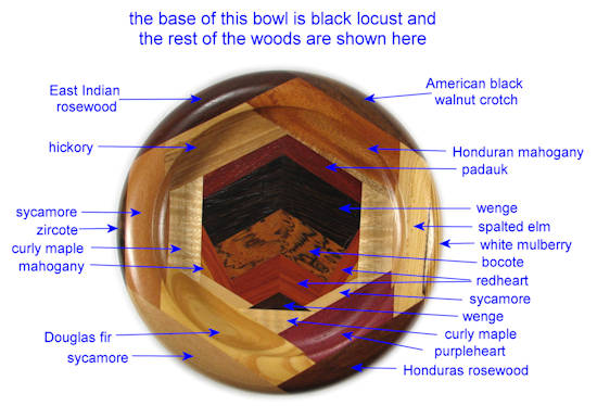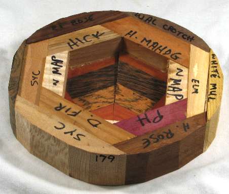 comments: The zircote at the left has the classic "cloud" grain. The curly maple on the left and right of the middle beautifully quartersawn, showing excellent ray flakes. The walnut crotch in the upper right is nicely curly and lightly chatoyant. The sycamore in the outer rim of the lower left is marvelously symmetrical in the flake pattern.
