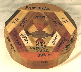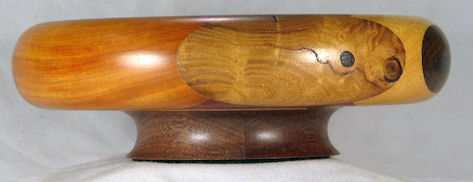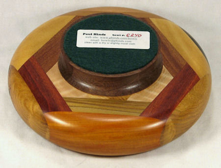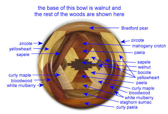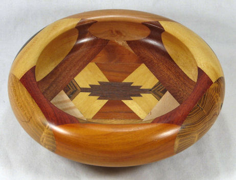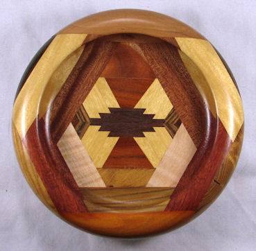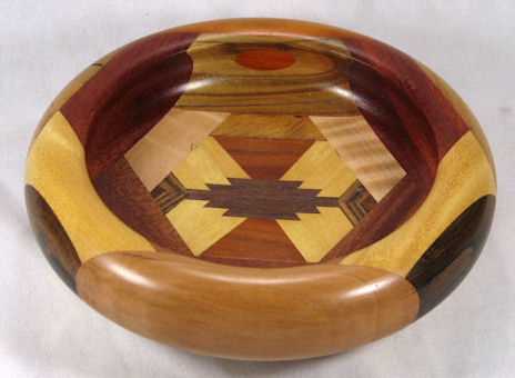 comments: The middle in this one was influenced by Navajo rug designs I saw in the American Southwest in the 1950's. The paela at the bottom is from the best piece of that species that I've ever worked, with a much more uniform deep orange color than is often the case with this wood, where the best color is usually just a patina about a eighth of an inch or so thick.