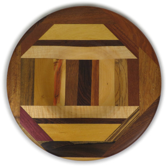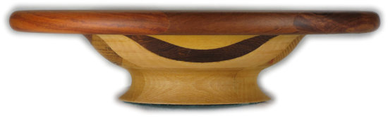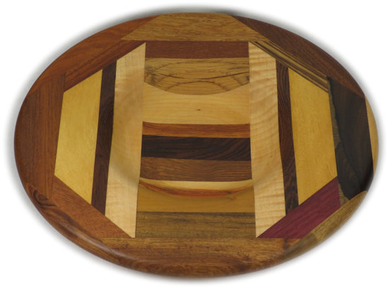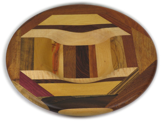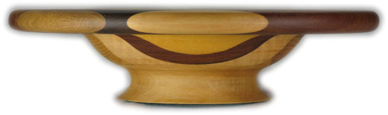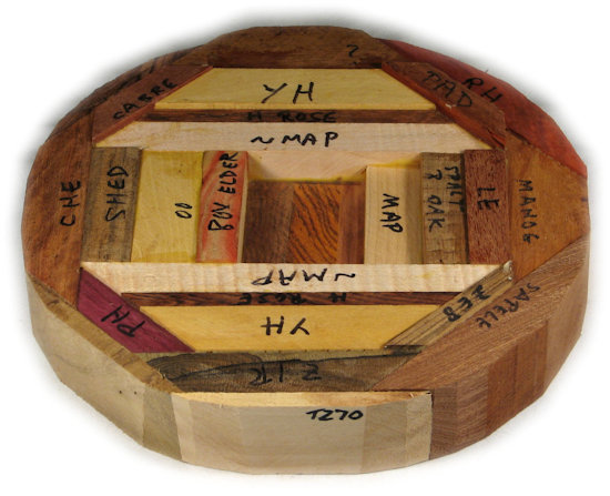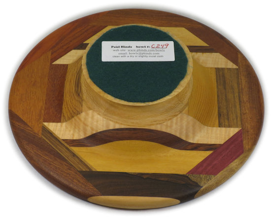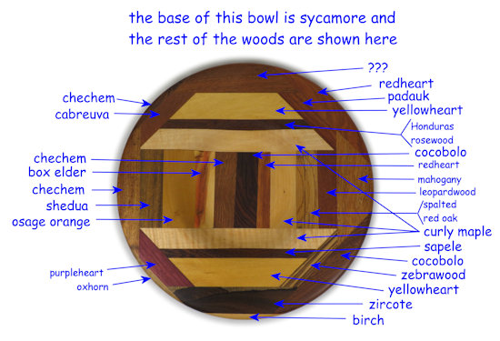 I ALWAYS POINT OUT ANYTHING THAT NEEDS TO BE COMMENTED ON. THESE ARE (UNLESS OTHERWISE STATED) THINGS THAT DO NOT DETRACT FROM THE BEAUTY OF THE BOWL, BUT I WANT TO BE SURE I GIVE A COMPLETE DESCRIPTION. SO ... The box elder in the middle left was beautiful in the blank (see pic below) but now that it's turned down it shows internal messiness that was unexpected, but that's the sort of thing that happens sometimes with wood, it being an organic material. The oak in the middle right has developed an internal crack that is quite visible AND a stress separation that is only lightly discernible by feel on the bottom where it meets the lacewood (it doesn't show up on the top at all).
