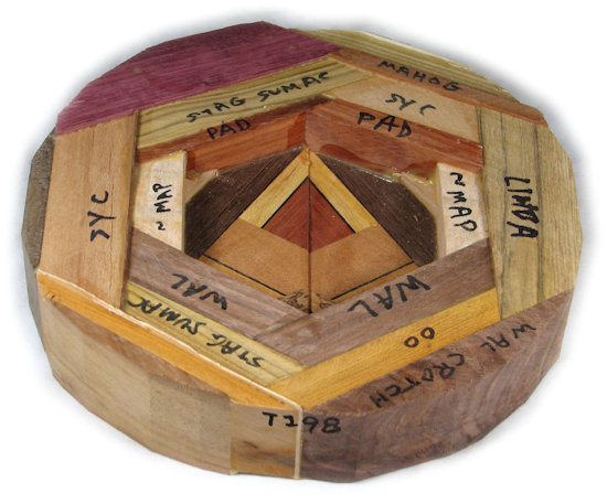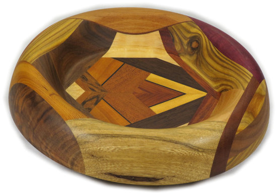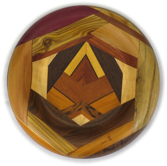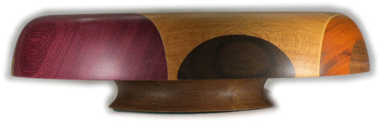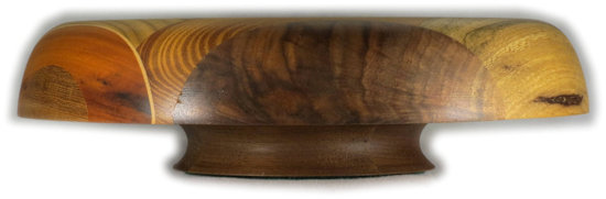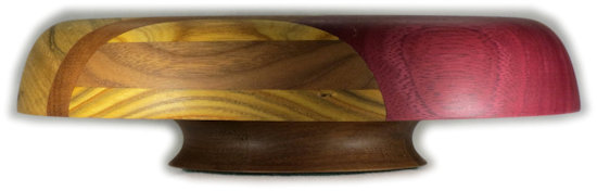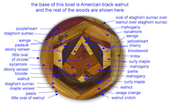 COMMENTS: This is a real beauty. The bold color contrasts in the middle look great, there are numerous excellent pieces of wood, and the undercut rim was very much worth the extra effort in turning, having produced a very pleasing curvature. The walnut crotch in the lower right is particularly nice and looking across it to the inside of the upper left you see a very swirly grain piece of staghorn sumac that was chosen for that reason even though it has pith-filled knot in it (the pith is punky but that really isn't an issue in such a small piece and the shellac/polyurethane finish has stabilized nicely. That sumac is backed on the outside rim by a great piece of purpleheart with a nice solid, uniform purple color.