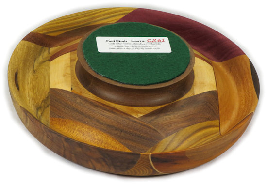 finish: one coat of natural stain then 3 thin coats of dewaxed shellac then 10 thin coats of semi-gloss polyurethane topped by 2 coats of clear flat enamel to take the shine off. Note that this enamel finish sometimes (including this bowl) has a weird effect on the pics without having a similar effect on the actual bowl. What happens is that the yellow woods become noticeably more yellow (again, in the pics, not on the bowl itself) and white woods take on a yellow tint. If I color-correct the white/yellow, then the reds and purples come out very wrong, so I leave the pics the way they are, but be aware that yellows in particular are slightly more yellow in the pics than in reality.