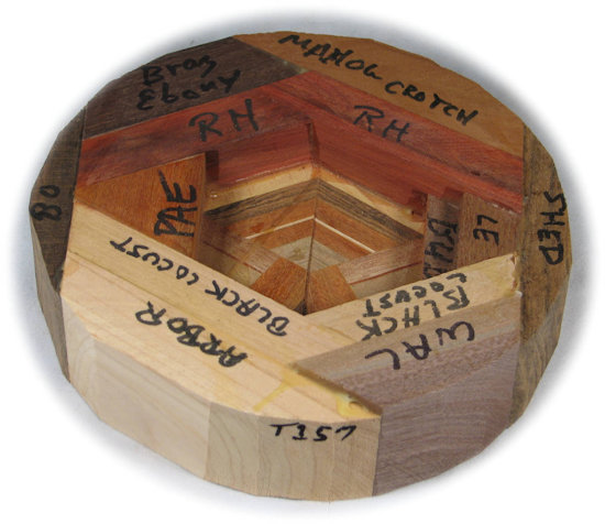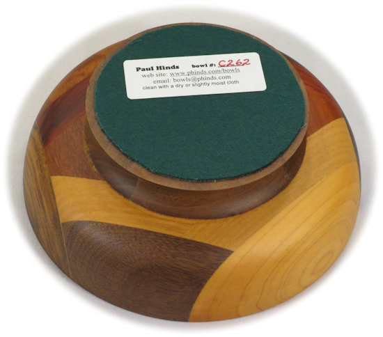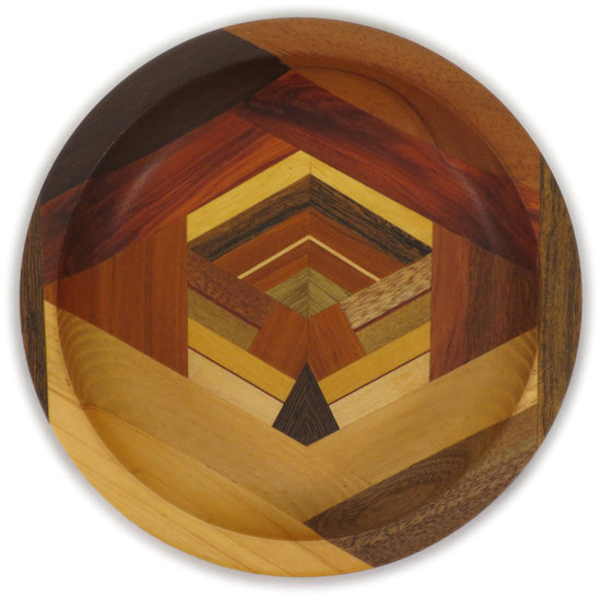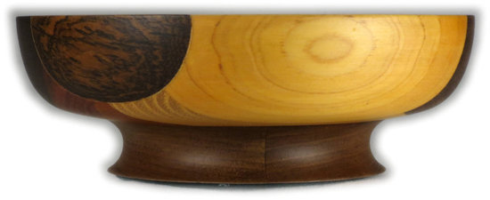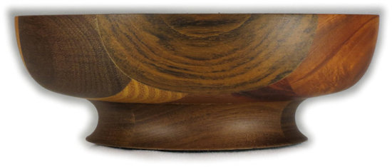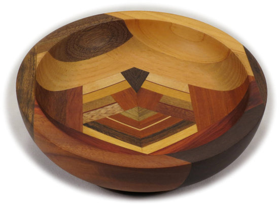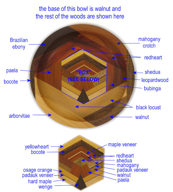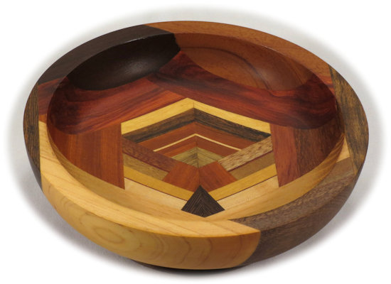 COMMENTS: The mahogany crotch piece in the upper right of the rim is really nice and the redheart pieces along the top of the "box" are standouts. Simple straight-forward bowl shape on this one. The complex angles in the middle make this one of those bowls where I will occasionally see it and think "uh ... now how did I DO that?"