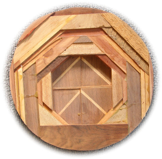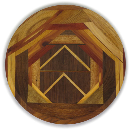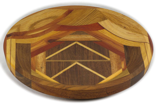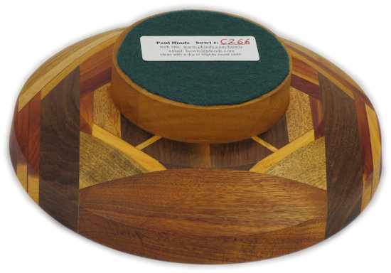 finish: one coat of natural stain then 2 coats of polyurethane (with UV blocker) then 8 thin coats of dewaxed shellac topped by 2 coats of clear flat enamel to take the shine off. Note that this enamel finish sometimes (including this bowl) has a weird effect on the pics without having a similar effect on the actual bowl. What happens is that the yellow woods become noticeably more yellow (again, in the pics, not on the bowl itself) and white woods take on a yellow tint. If I color-correct the white/yellow, then the reds and purples come out very wrong, so I leave the pics the way they are, but be aware that yellows in particular are slightly more yellow in the pics than in reality.