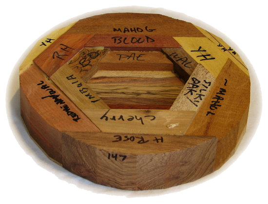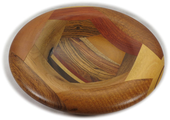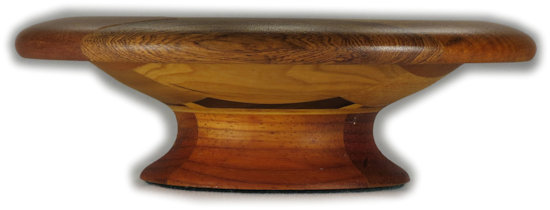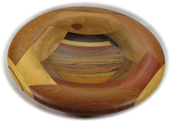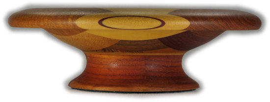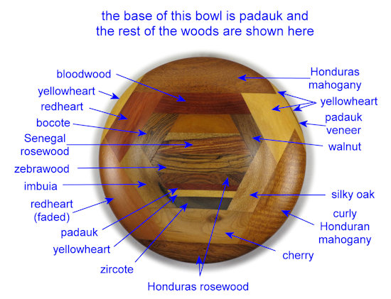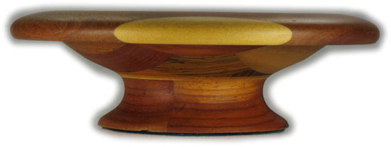 COMMENTS: I particularly like the way all the highly figured woods in the middle go together. I'm not sure whether to say they complement each other or clash with each other, but whichever it is, I like it. The rim is only lightly undercut on this one, making for a nice gentle curve over the top of the rim. The curly Honduran mahogany in the lower right is a standout and the red oval of padauk veneer inside layers of yellowheart on the upper right rim is a nice touch.
