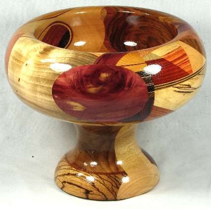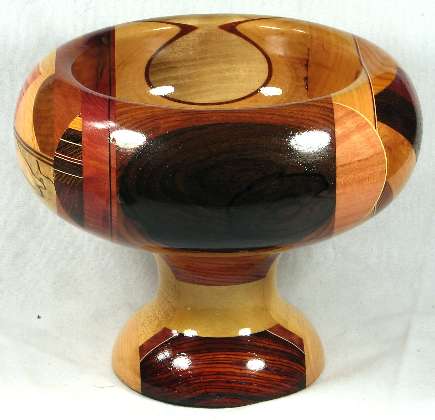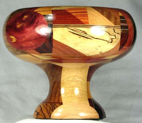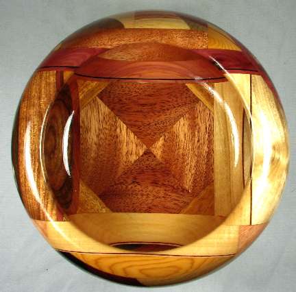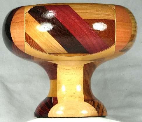 view 1: the slants are, from the lower left: lacewood, cherry, wenge, purpleheart and the horizontal pieces on the right are cypress over mahogany. All of this is over thick walnut veneer the yew and it's all backed by maple veneer then walnut veneer then pine(?).