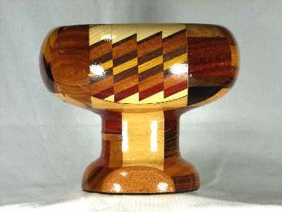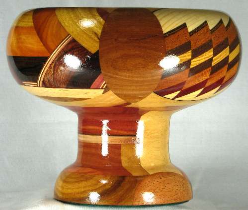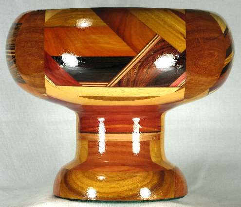 view 7: an elaborate lamination. Along the left from the top down is osage orange, paela, redheart, ash. To the right of the redheart is zircote and below that is a lamination of mahogany veneer and maple veneer. Along the right from the top is a little wedge of mahogany, canary, panga panga, makore, and then a little section of lamination of mahogany veneer and maple veneer. To the left of the canary is paela and to the left of the zircote is chechem and to the left of that is a long slant of lamination of mahogany veneer and maple veneer. Below it all is padauk veneer over obeche over ? and behind it all is pine, aromatic red cedar