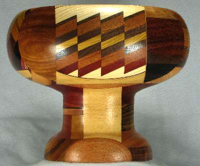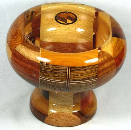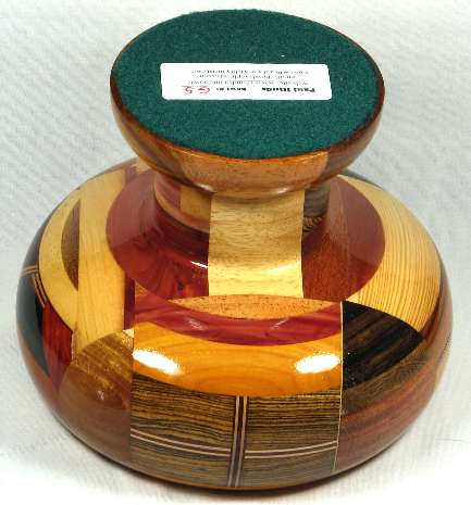 comments: Lots of excellent wood in this one and an overall set of laminations which, which likely to seem a little "busy" to some, give what I feel is an exceptionally pleasing effect. I particularly love the lamination in view 7. The billy webb wood in view 6 and 8 is chatoyant, as is the machiche in views 2 and 4. The orange-colored osage orange in view 3 is a real standout. To me, it's really neat the way the back sides of the view 7 and view 1 laminations show through from the inside in little ovals.