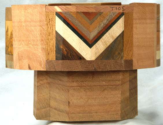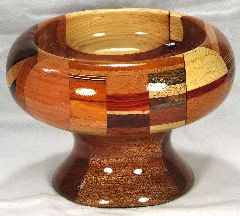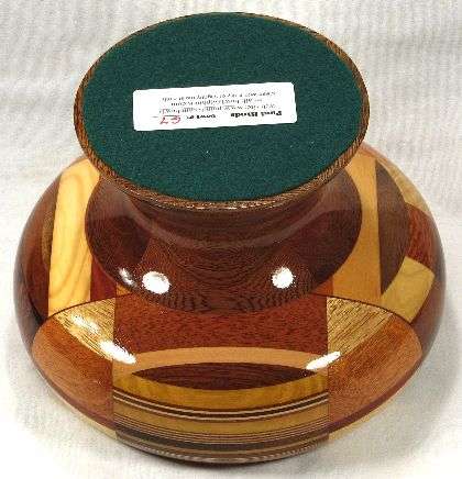 comments: This is a slightly "busy" one, but I think all the complex laminations around the rim work well and make for an attractive look. This bowl sat around for a while before the UV blocker was applied and some of the woods have darkened just a hair from what you see in the pics.