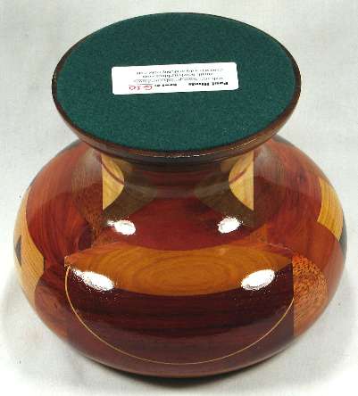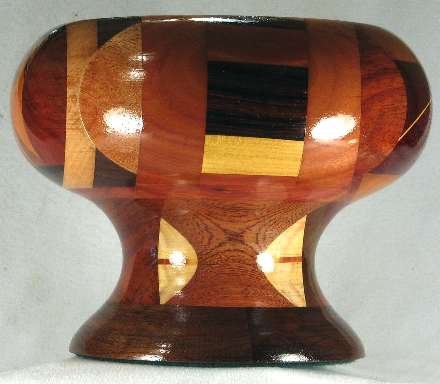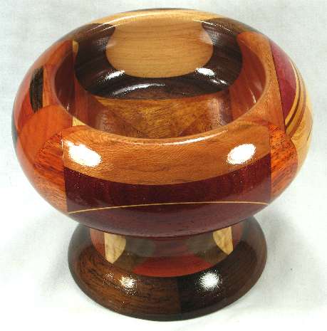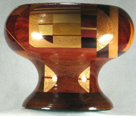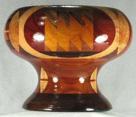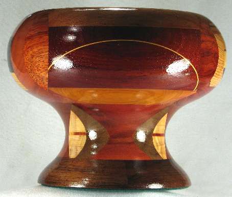 flaws/issues: several of the wood have faded or darkened with time including the jagged area in view 1b, where the redheart on each side of the jagged area has faded on dark tan and the paela middle pieces of the jagged area have all faded to a similar dark tan, so the jaggedness no longer stand out at all. The bright yellow osage orange in the bottom middle of view 3b had darkened to a dull golden brown. Because of all this, plus the fact that on reflection, I just don't love this bowl, I've reduced the price from $125 to $75.
