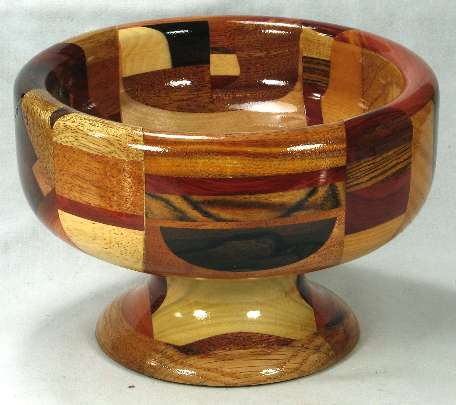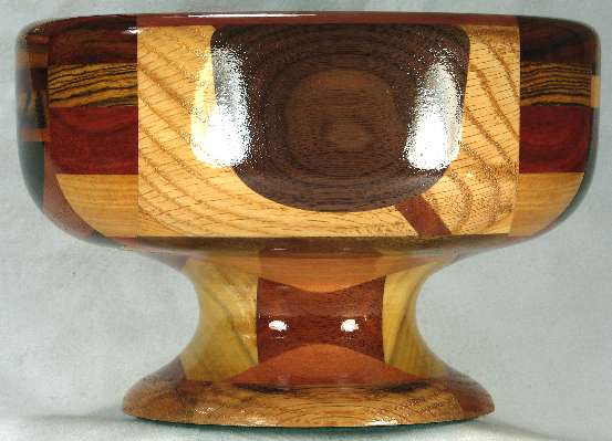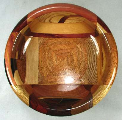 comments: The piece of bubinga from which the bubinga in view 1 was taken had numerous flaws so I had to cut out good sections and I'm very pleased with how I was able to make use of them in this bowl.