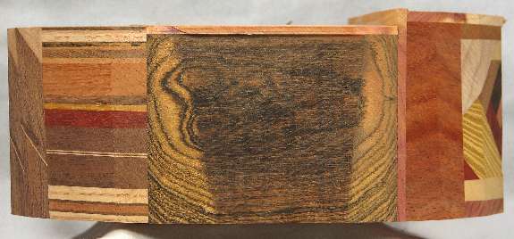 view 3: bocote, white oak, yellowheart (a very pale colored piece), and all of that topped by a thin rim of white pine.