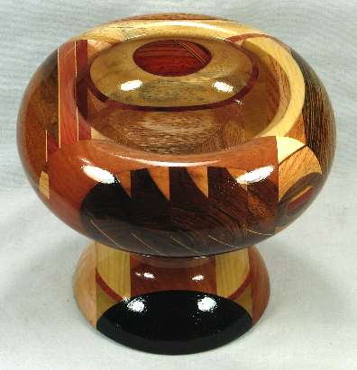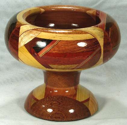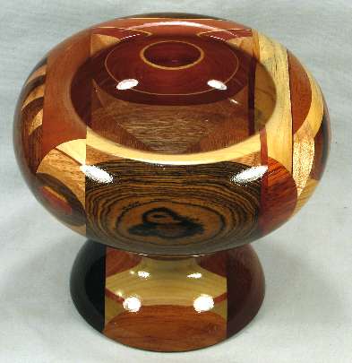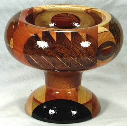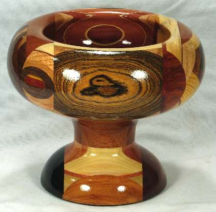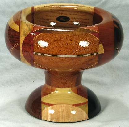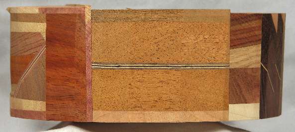 view 1: jagged lamination of aromatic red cedar over Honduras rosewood over holly veneer over Honduras rosewood, all backed by makore and then on the left, a small lamination of mahogany over oak over bubinga and on the right a complex lamination starting with thick walnut veneer over 2 layers of cerejeira veneer redheart over walnut and all of that backed by an oval of walnut then white oak then red oak madrone veneer, tulip poplar