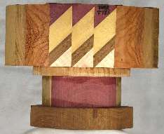 view 1: a jagged lamination of, from the top down, purpleheart, yellowheart, panga panga, curly maple, and on each side of that is macawood (butt end) and all that is backed by billy webb wood