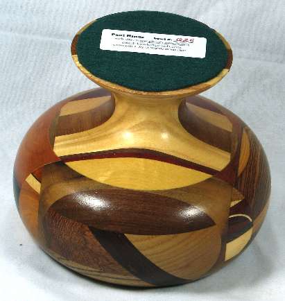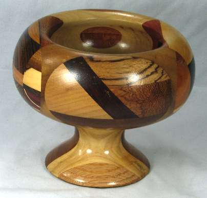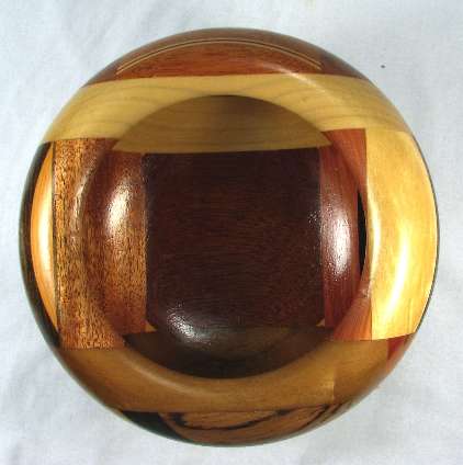 comments: If you look at the views at the bottom of the page of the bowl blank, you'll see that in view 5 the base has a nice lamination in the middle of the redheart but as you can also see, it got totally turned off in the final bowl. I hated to lose it, but I had to in order to get the bowl to the shape I wanted. Sometimes the wood wins, sometimes the shape wins. Similarly, in view 1 of the base, the zebrawood (that has the temporary ID #299 on it) has been completely turned off in the final bowl.