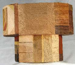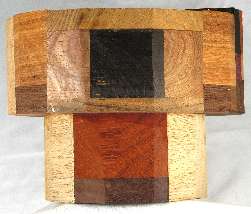 view 1: complex lamination in front of birch, thick walnut veneer, aromatic red cedar. To the left of the birch is a small wedge of afrormosia above an even smaller wedge of mahogany. The complex lamination is, left to right across the top, padauk (orange colored, not red), redheart, osage orange, a tiny arc of padauk, osage orange. The bottom pieces are sipo on the left and redheart in the middle