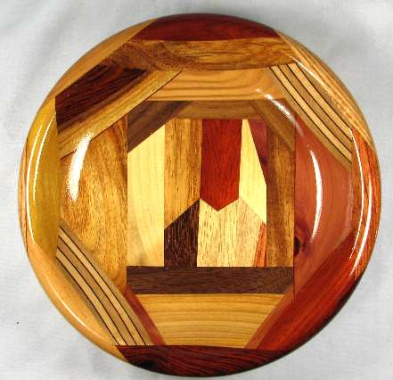 BOX: walnut on the bottom and both upper corners. left to right: pine, narra over wenge, two pieces of padauk over two pieces of prima vera, aromatic red cedar over pine over tulip with sapwood , mahogany