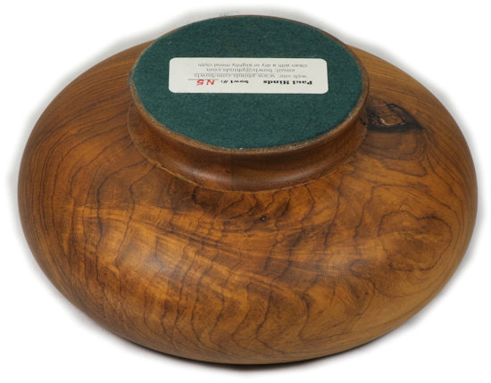 I ALWAYS POINT OUT ANYTHING THAT NEEDS TO BE COMMENTED ON. THESE ARE (UNLESS OTHERWISE STATED) THINGS THAT DO NOT DETRACT FROM THE BEAUTY OF THE BOWL, BUT I WANT TO BE SURE I GIVE A COMPLETE DESCRIPTION. SO ... there is a small chip-out in the very middle. I could have turned down past it but considered it too minor to bother with. The crotch has some blue stain in it --- that's more wood character than flaw but I'd rather that it wasn't there.