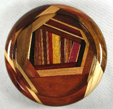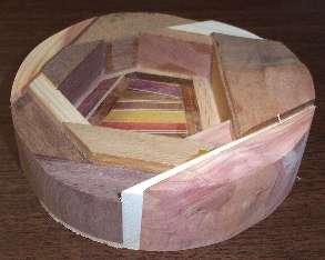 BOX (left to right): ? (dark wood), chechem, hard maple veneer, mahogany veneer, hard maple veneer, mahogany, hard maple veneer, mahogany veneer, hard maple veneer, redheart, yellowheart, hard maple veneer, mahogany veneer, hard maple veneer, mahogany, hard maple veneer, mahogany veneer, hard maple veneer, chatoyant chechem (looks brown from one angle, orange from another), hard maple veneer, purpleheart, tiny strip of ? and then that same unknown dark wood that started it off on the left.