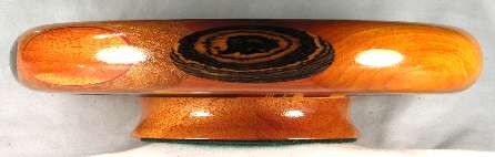 BOX: The bottom is wenge and then the mirrored sections, from the bottom up, are: padauk, hard maple veneer, ebony veneer, hard maple veneer, padauk veneer, hard maple veneer, bocote, hard maple veneer, bocote, yellowheart, purpleheart, yellowheart, wenge, redheart, quartersawn poplar with ray flakes, and on the upper corners, purpleheart, then the lacewood of view 5.