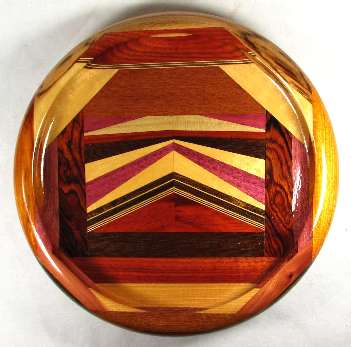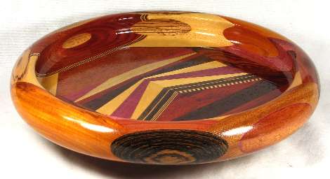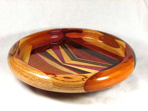 comments: ALL of the wood in this one is really nice but the bocote on the outer rim of views 1 and 8 has a particularly attractive grain contrast (unless of course you don't like it, in which case you might see it as particularly ugly) and the cocobolo in views 3 and 7 is outstanding. There are several chatoyant pieces including the paela in views 3 and 7, both the oak and the bloodwood in view 5 and the mahogany in view 1. This bowl does a particularly nice job of showing off a lot of exotic woods.