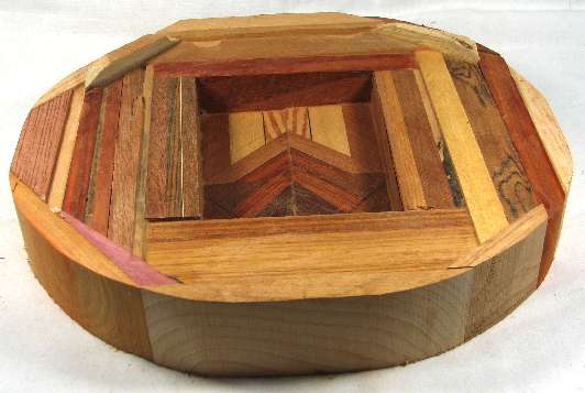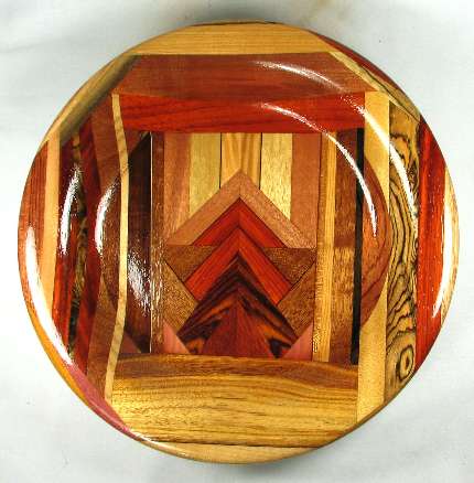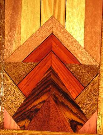 BOX: The bottom triangle is ?, then cocobolo and mahogany, with padauk above the cocobolo. Above the mahogany is ebony veneer, which is also present above the padauk. Above both ebony veneers is mahogany (nicely chatoyant). From the middle of the box (at the top of the mahogany) up: padauk, ebony veneer, sapele, and the a vertical lamination of (from the center outward): douglas fir, ebony veneer, yellowheart, sapele.