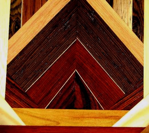 BOX: bottom triangle (flat cut) and corner wedges (quartersawn) are all cocobolo; cocobolo wedge is topped by holly veneer, then quartersawn cocobolo, holly veneer, quartersawn wenge, sycamore(?). The upper portion, left to right: bocote, holly veneer, bubinga, bocote, holly veneer, bocote, [middle], bocote, holly veneer, bocote, cocobolo with sapwood, bocote