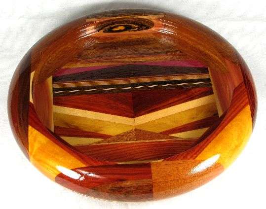 view 1: redheart over maple veneer over ? (grainy brown), over ? (orange --- probably paela), all backed by bocote (showing sapwood on the bottom), aromatice red cedar, canary (with a wide streak in the middle of it that looks a little like walnut), BOX. On the left and rigth of view 1 are small wedges of ? (purplish brown)