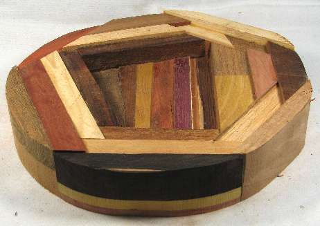 BOX: from the left: wedge of mahogany, chechem, osage orange, redheart, purpleheart, maple veneer, mahogany, then the bubinga of view 3