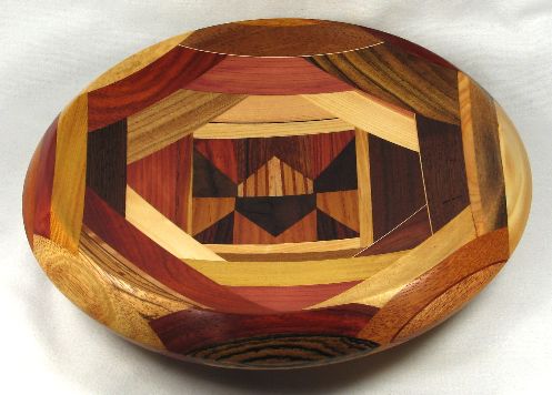 BOX: upper middle is a lamination of thick mahogany veneer and thins. Middle thins are ash, outer ones are oak and the middle two each are cherry. This lamination is sided by very dark pieces of American black walnut. The upper sections are tzalam(?) sided by bubinga. The lower middle is zircote(?) sided by narra and below that is ? sided by cocobolo.