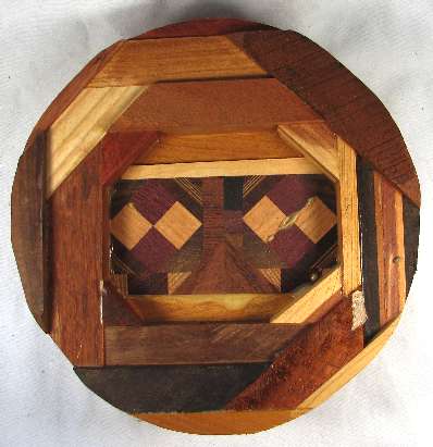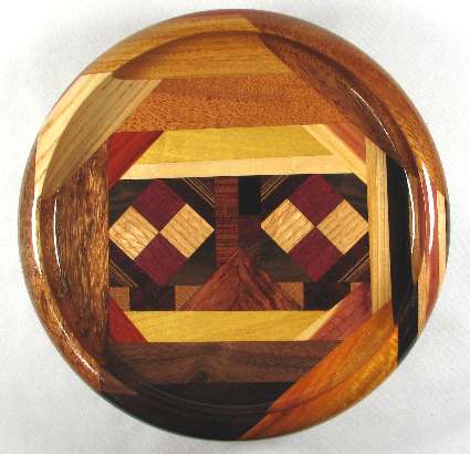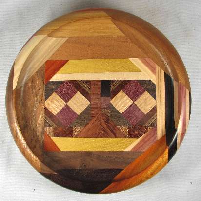 BOX: left corners are padauk, right corners are aromatic red cedar, upper and lower segments are osage orange and at the top below the osage is an unidentified white wood (the color is hard maple, but I don't think that's what it is). The middle of the box is red oak and purpleheart squares with misc other woods (including walnut and bubinga) and laminations.