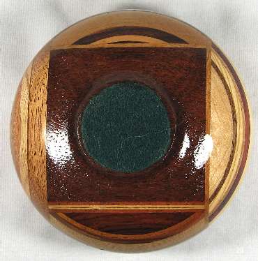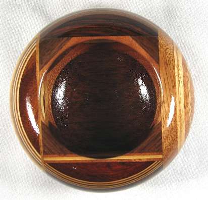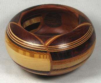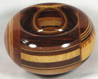 NOTE ABOUT CHANGE IN FINISH This bowl developed a small stress separation in one of the laminations near the bottom and in the process of repairing this, I redid the finish in LOW-gloss polyurethane so that the bowl now has the "look" shown in the rightmost image at the very bottom of the page rather than the "shiny, wet" look shown in the other pics on this page. Also, there is now a crack in the meranti of the base, but it does not detract from the beauty of the bowl and to even see it you have to hold the bowl upside down or look directly into the opening from the top.