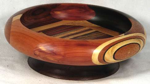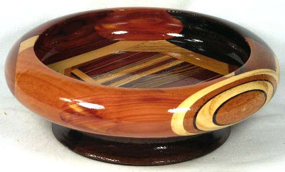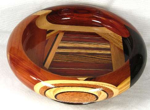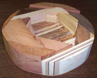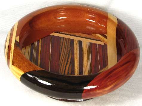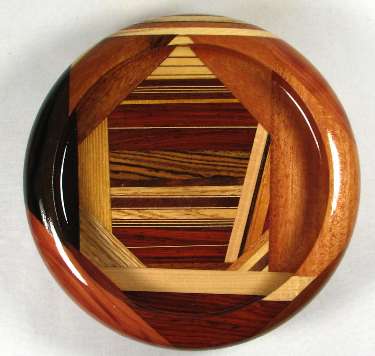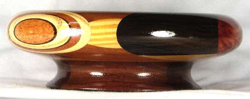 BOX: lower left corner is red oak, lower right corner is (from corner) hard maple, walnut, hard maple, African mahogany. On the right at a slight slant, from the inside, flake maple, macassar ebony thin, mahogany, and a tiny wedge of padauk. From the bottom up, walnut, cocobolo, hard maple veneer, cocobolo, hard maple veneer, thick mahogany veneer, hard maple veneer, thick mahogany veneer, hard maple veneer, mahogany veneer, oak, mahogany veneer, maple veneer, walnut, maple veneer, mahogany veneer, oak, ? (grainy brown wood), bocote, cocobolo, hard maple veneer, cocobolo, and then the yellow thin of view 5