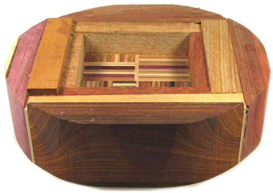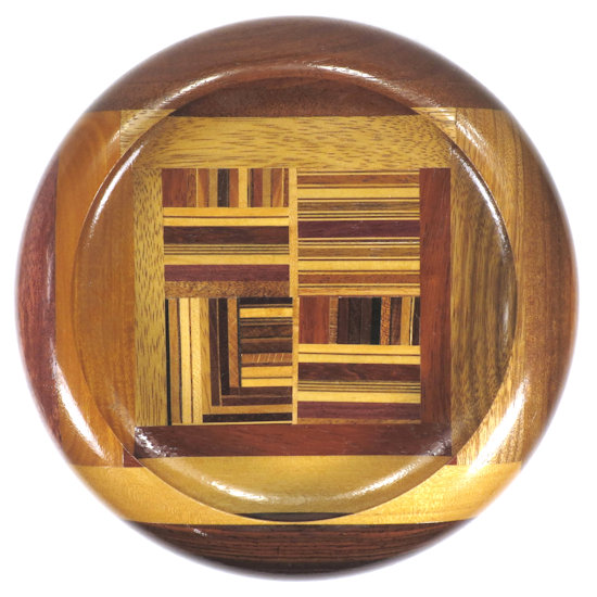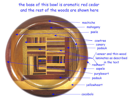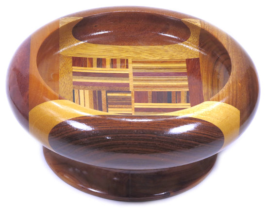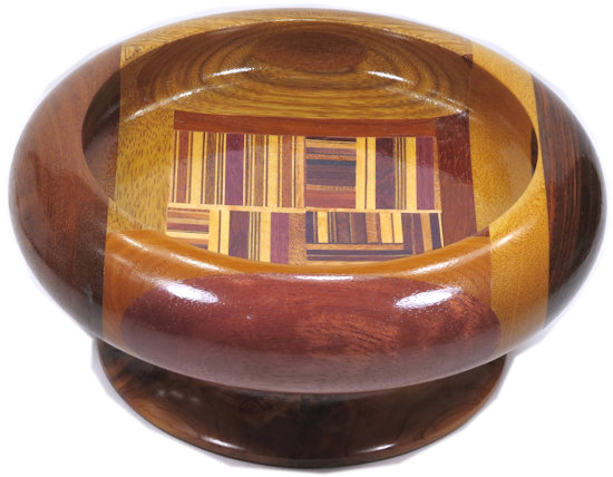 The box (that is, the middle part) of this bowl is made from some unfinished parts of very elaborate 2"-cube laminated building blocks that I made for my son when he was young. This was 20 years ago and I don't even remember what all woods I used back then, thus the many unidentified woods in the description below.