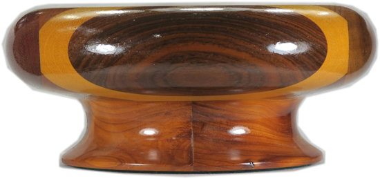 I ALWAYS POINT OUT ANYTHING THAT NEEDS TO BE COMMENTED ON. THESE ARE (UNLESS OTHERWISE STATED) THINGS THAT DO NOT DETRACT FROM THE BEAUTY OF THE BOWL, BUT I WANT TO BE SURE I GIVE A COMPLETE DESCRIPTION. SO ... The mahogany at the top has a minor gum inclusion on the right side that shows up as a rough spot on the outer rim. The cocobolo at the bottom has a barely perceptable edge jag underneath the rim due to different movement than the yellowheart behind it.
