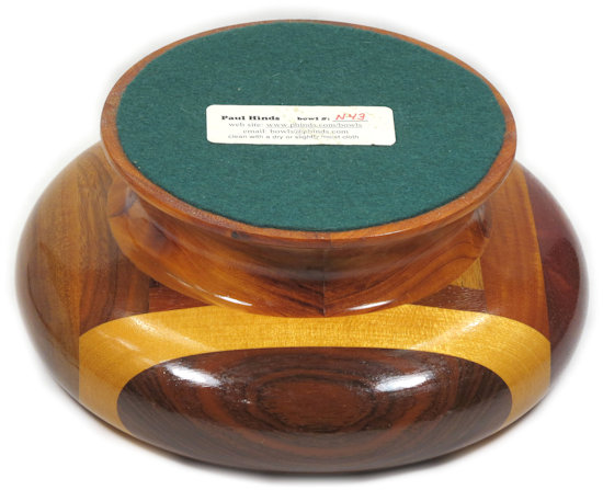 COMMENTS: The woods around the rim are ALL excellent and there's a lot of chatoyance (the purpleheart and, paela in particular and the yellowheart a little). The middle area was not turned down as far as it could have been, so that combined with the larger than usual base makes this bowl have a little more heft than most.