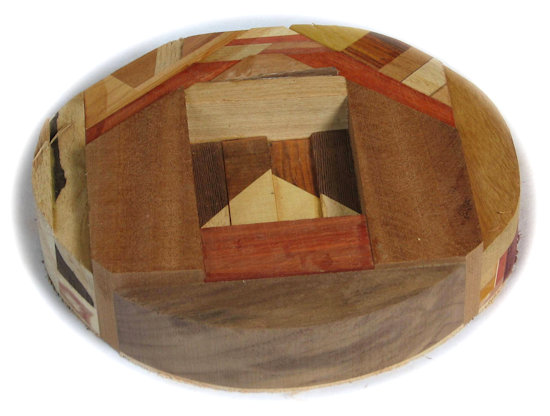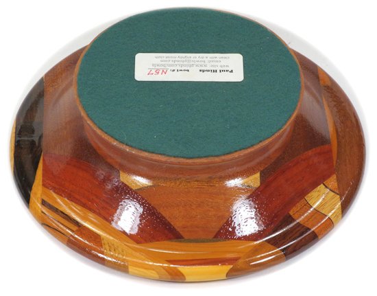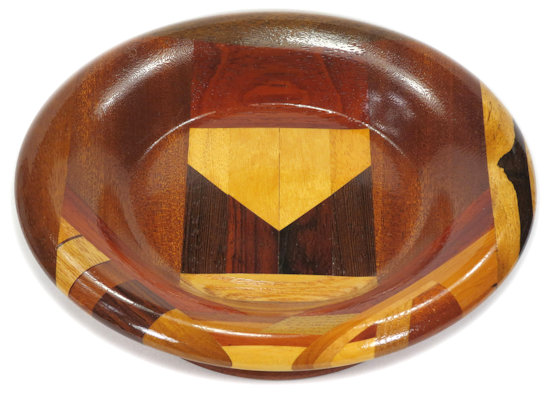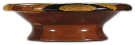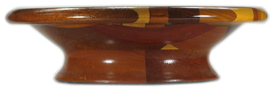 COMMENTS: VERY nice pleasant curved shape to this one. The mahogany on both sides of the middle is nicely chatoyant as is the base, and the wood is excellent throughout the bowl.