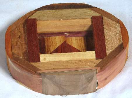 view 1: walnut, holly veneer, ebony veneer, maple veneer, padauk veneer, aromatic red cedar, ? (pale tan), red elm, prima vera, purpleheart, BOX