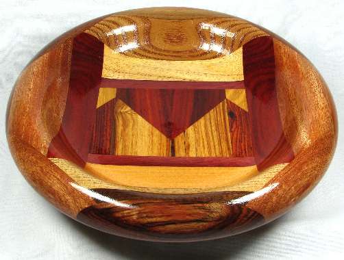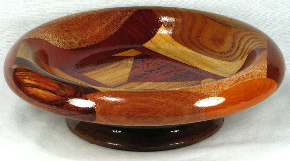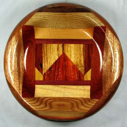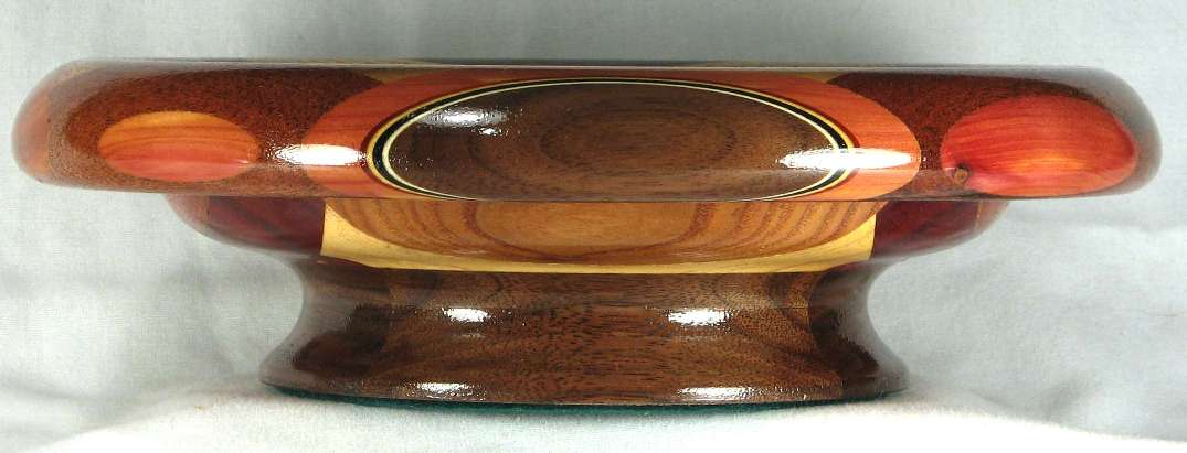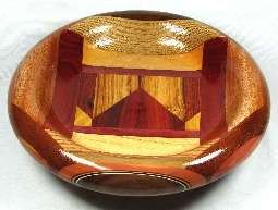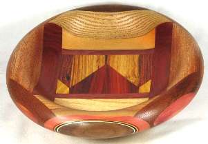 comments: VERY pleasant curve shape on this bowl and excellent wood throughout, especially in the box but also the chechem in view 5 and the chatoyant mahogany in views 3 and 7. The grain arrangement of the elm in view 1 came out amazingly well, even to the point of having an internal omega curve as you can see in the first pic below.