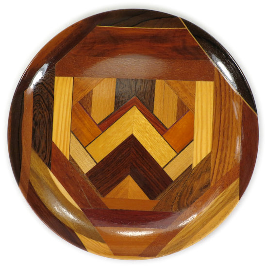 COMMENTS: The zircote in the upper right was a real standout when the wood was raw and in fact dictated the shape of the bowl because I just HAD to do a vertical side to keep the full effect of the ray flakes on this piece. Unfortunately, they do not show up nearly as well now that the polyurethane has been applied. I'm pleased with the overall pattern of this bowl, especially the design and the boldly contrasting colors in the middle. The wenge on the inner left side looks great and the redheart at the top is also particularly nice.