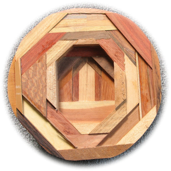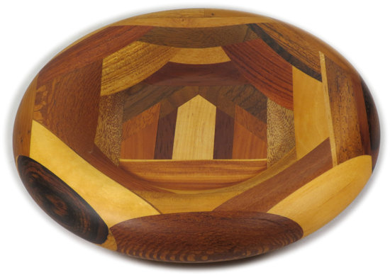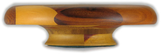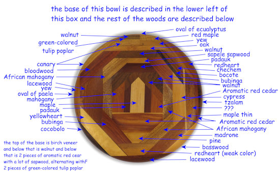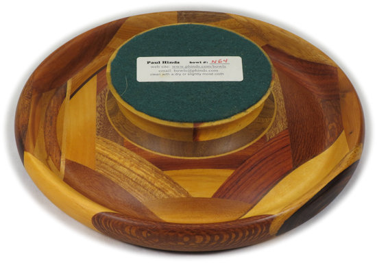 finish: one application of natural stain then 3 coats of high gloss spar polyurethane (with UV blocker) topped by 2 coats of clear flat enamel to take the shine off. Note that this enamel finish sometimes (including this bowl) has a weird effect on the pics without having a similar effect on the actual bowl. What happens is that the yellow woods become noticeably more yellow (again, in the pics, not on the bowl itself) and white woods take on a yellow tint. If I color-correct the white/yellow, then the reds and purples come out very wrong, so I leave the pics the way they are, but be aware that yellows in particular are slightly more yellow in the pics than in reality.