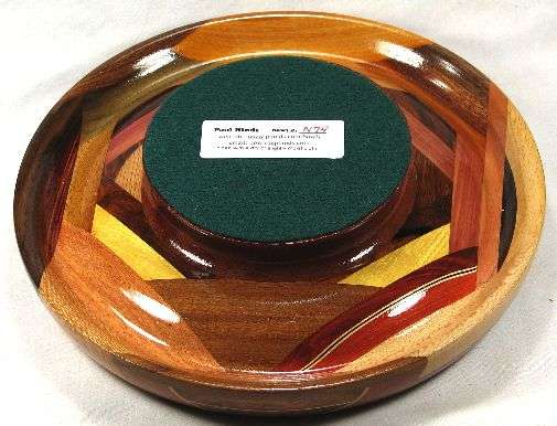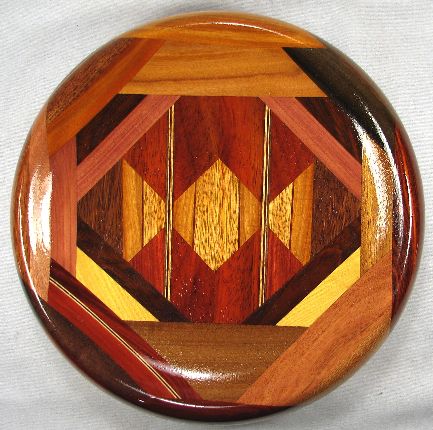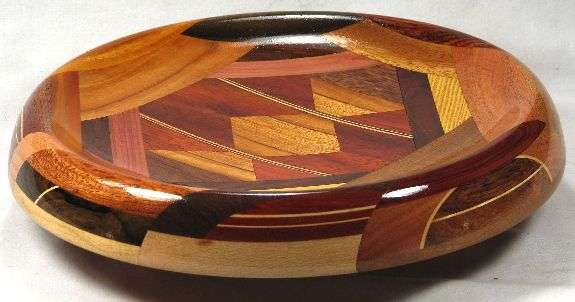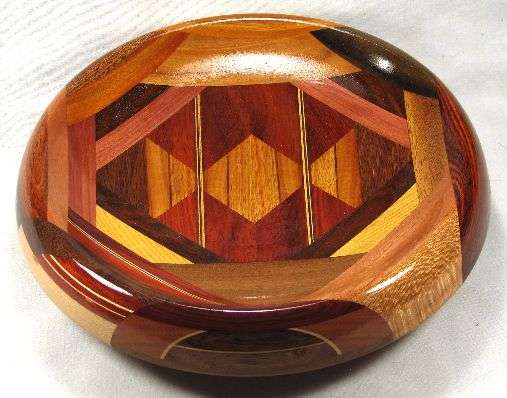 BOX: In the middle between the two vertical lamination is canary, thick mahogany veneer, canary in the middle with padauk above and below. The two vertical laminations are, from the inside towards the rim, thick mahogany veneer, thick oak veneer, thick mahogany veneer, maple veneer, thick walnut veneer. Outside the laminations is canary, thick mahogany veneer, canary, with padauk above and redheart below.