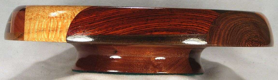 view 1: two ? brown woods separated by maple veneer and backed by maple veneer, then redheart over cherry, afrormosia