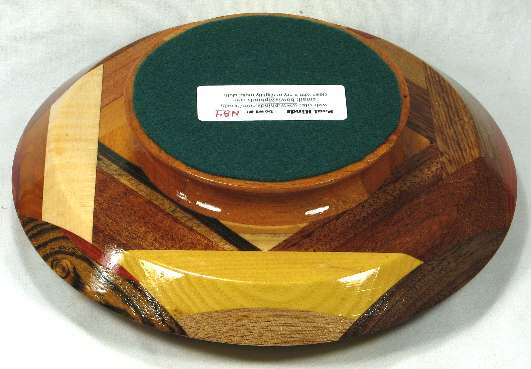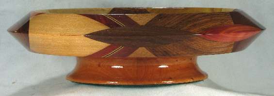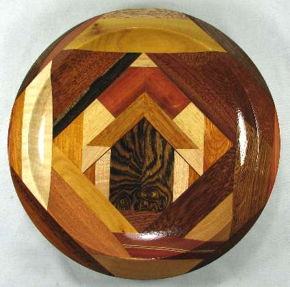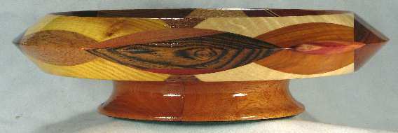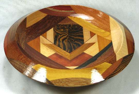 BOX: middle is bocote sided by maple sided by snakewood. Above that is padauk veneer then canarywood slants ending in ?(light wood --- could be maple but I don't think so), then above that is redheart slants ending in prima vera.