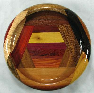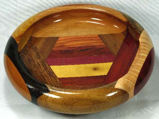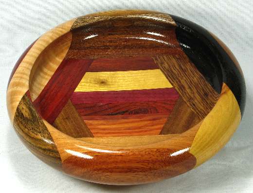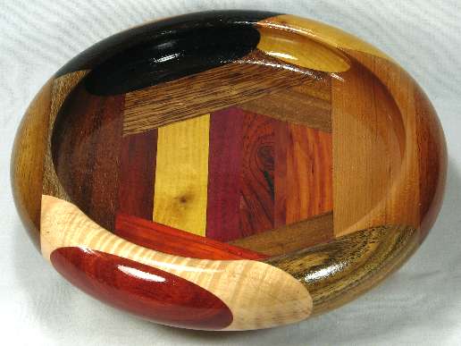 comments: the macawood in view 1 is nicely chatoyant and the yew/wenge combination in view 4 looks terrific, as does the bloodwood/maple combination in view 6. There are fewer types of wood in this bowl than is typical for my bowls, but they are all great with the single exception of the bocote in view 8 which is not bad in any way, just not at all a standout for the species.