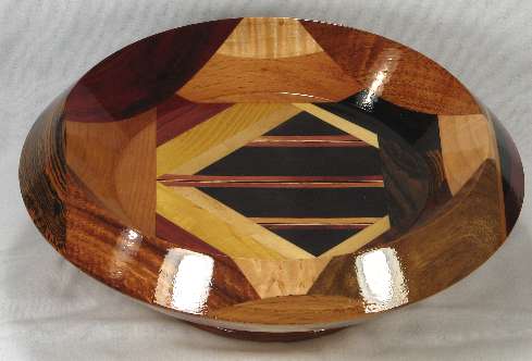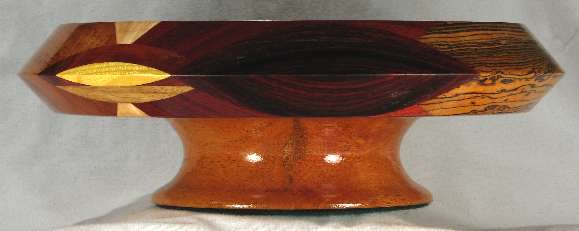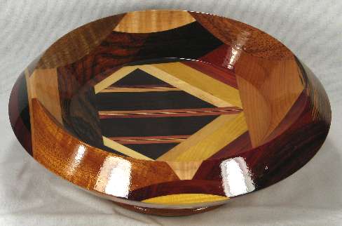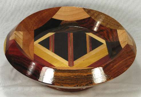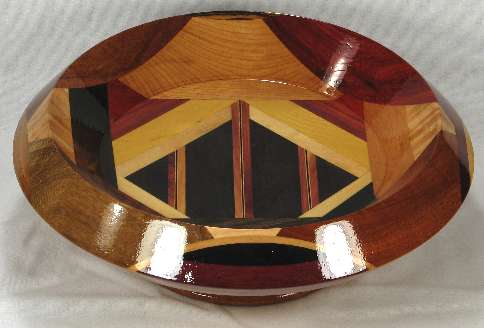 comments: The bloodwood in the upper right has outstandingly deep blood red color, the bocote at the top is excellent, the padauk wedges in the upper left and upper right are a terrific orange color. The base on this one is thicker (up/down) than in most of my bowls.