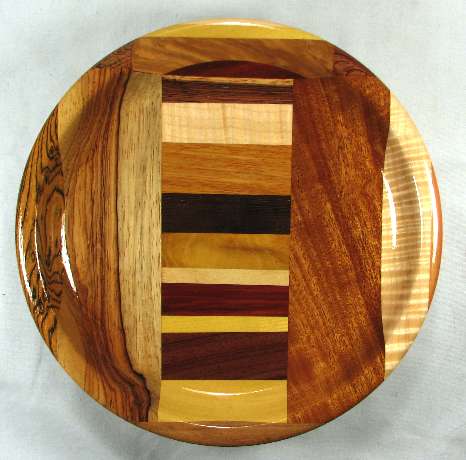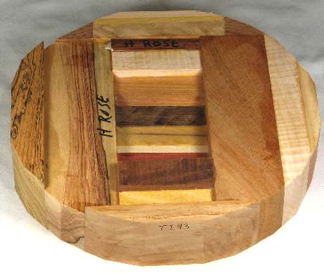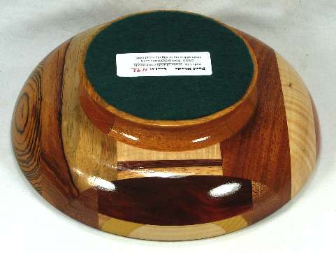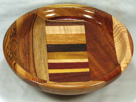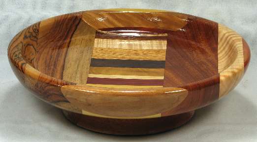 comments: The construction technique on this one is different than most of my bowls in that the vertical section in the center (with all the woods running horizontally in the orientation view) was done up first and then the sides were added to that, allowing room for large chunks (Honduras mahogany in view 3 and Honduras rosewood in view 7) that I think look really good.