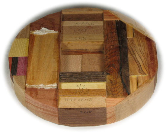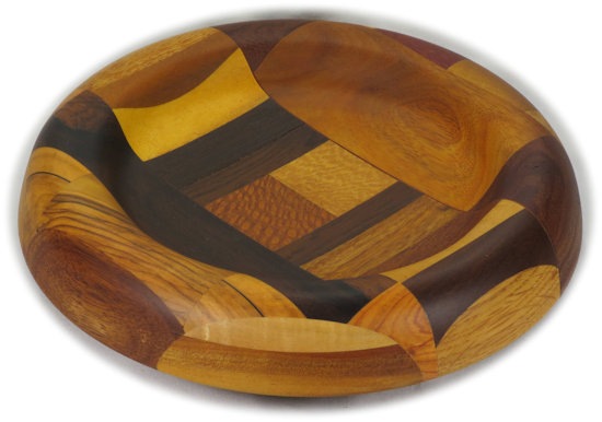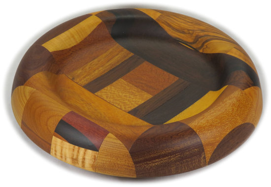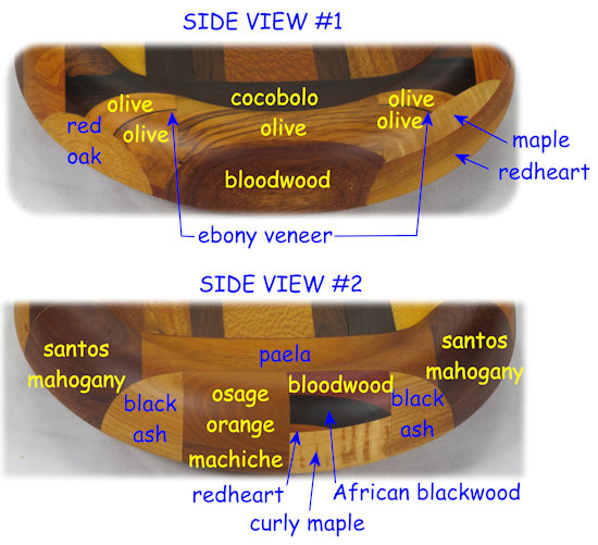 COMMENTS: Very nice overall curvature --- a case where the undercut rim gives, as it so often does, a very pleasing result. In the big piece of cocobolo in on the right side what looks like it is probably sapwood at each end is actually not. This is one of those pieces of cocobolo that has two radically different colors, one very dark and the other much lighter, right next to each other. Most of the lighter part got turned off but you can see it clearly in the bowl blank image below. The olive on the right side is particularly nice as is the paela on the left side.