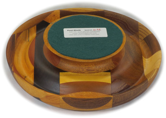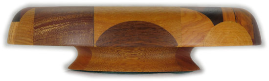 I ALWAYS POINT OUT ANYTHING THAT NEEDS TO BE COMMENTED ON. THESE ARE (UNLESS OTHERWISE STATED) THINGS THAT DO NOT DETRACT FROM THE BEAUTY OF THE BOWL, BUT I WANT TO BE SURE I GIVE A COMPLETE DESCRIPTION. SO ... The curly maple on the left rim has picked up a small amount of colored dust in the areas where the interlocked grain is pointing mostly outward, and this has given them an unnatural dark-stripe effect. There is a small stress separation at the bottom of the middle where the wenge meets the cocobolo. You can see it if you catch the light just right but most of the time it's invisible. None-the-less I've reduce the price a bit because of it from $150 to $125.